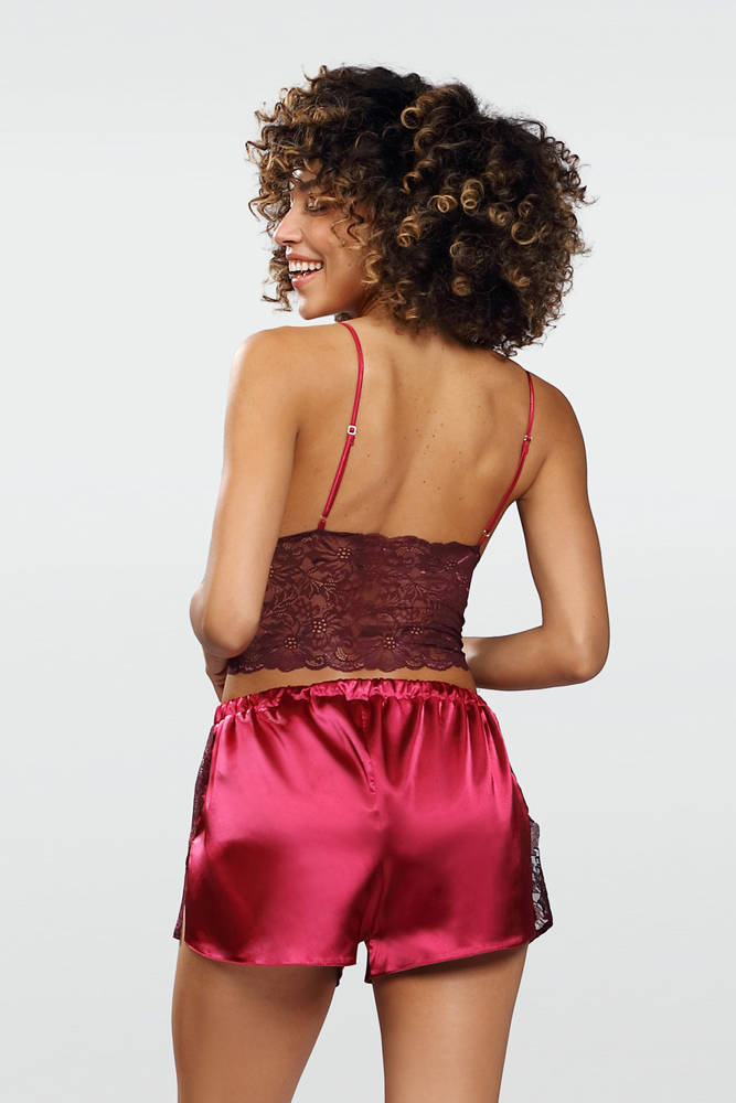 Komplet Patty składa się z koronkowego topu i satynowych spodenek z koronkową wstawką. Jeśli chcesz zaskoczyć swojego partnera z całą pewnością ten komplet to doskonały wybór. Bordowa koronka i satynowe spodenki dodają pikanterii całości. Gorący komplet Patty to świetna propozycja na prezent dla niej, np. na rocznicę. Odważny i piekielnie seksowny. Kusząca bielizna nocna Dkaren sprawi, że poczujesz się seksowna i pewna siebie.