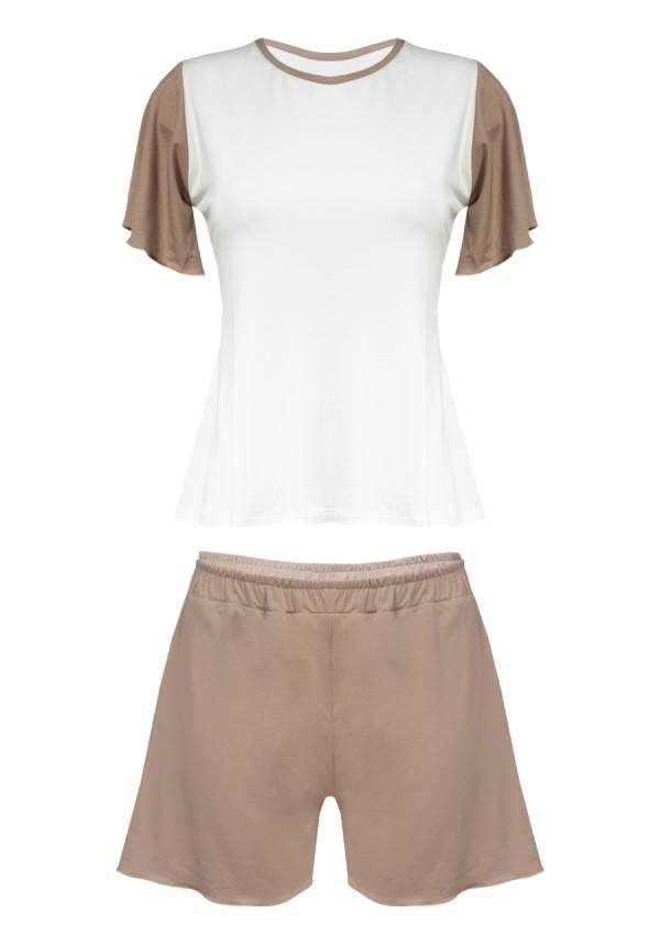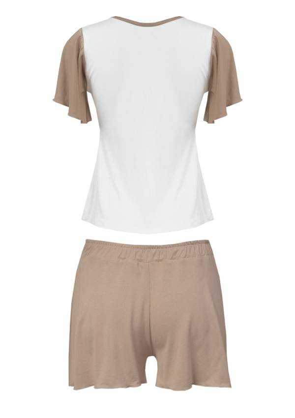 Komplet Alana wykonany z przyjemnej wiskozy. Komplet jest bardzo komfortowy, a zarazem elegancki. Luźna góra i szorty. Szukasz czegoś wyjątkowego po domu? Nasz komplet bielizny jest idealny! Kobiecy i uroczy, posiada delikatne falbanki na rękawach i spodenkach co nadaje całości dziewczęcego romantyzmu. Wykonany z miękkiej wiskozy, jest w najmodniejszych kolorach ecru i brązowym, które są idealne na wieczory w domu. Sprawdź nasz zestaw piżamowy z wiskozy! Ten zestaw z pewnością sprawi, że poczujesz się pięknie podczas relaksu w domu.