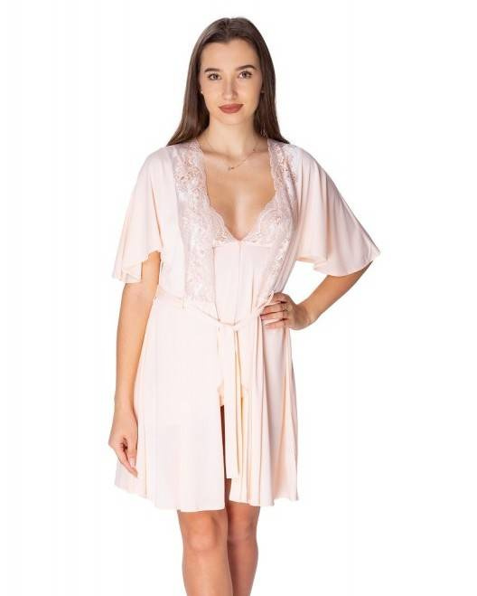 delikatny i lekki szlafrok damski z krótkim rękawem. Peniuar wiązany jest w pasie, a jego górna część zdobiona jest delikatną i zmysłową koronką. Peniuar ma dekolt wykończony delikatną koronką, a rozkloszowany kształt nadaje mu lekkości, natomiast motylkowe rękawki kobiecego charakteru.