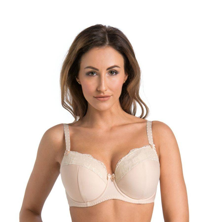 Biustonosz wykonany jest z materiału o wysokiej jakości, zdobiony na miskach koronką o wyrazistym motywie różanym. Od wewnątrz w miskach podszyty jest delikatną przewiewną bawełną, przyjazną dla skóry.