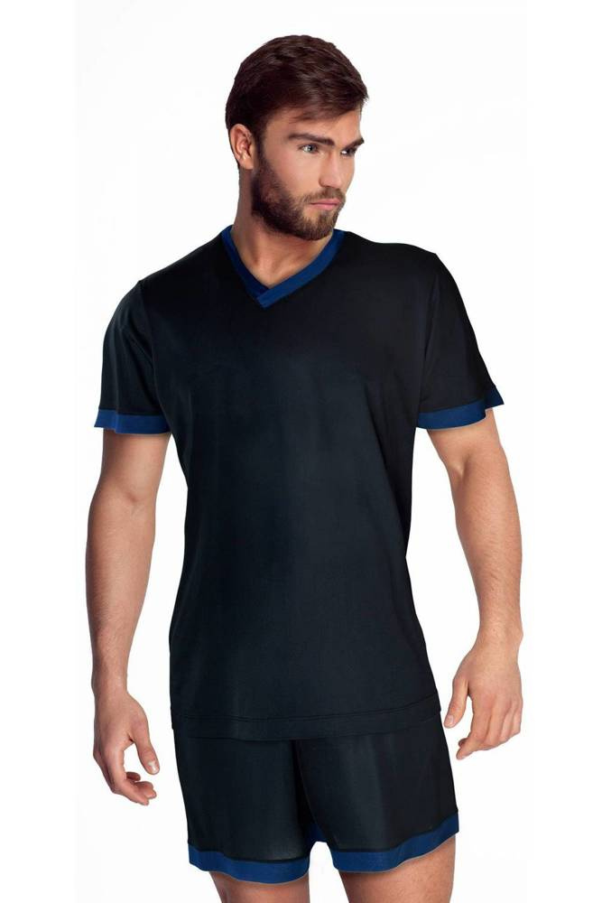 Piżama męska posiada koszulkę z krótkim rękawem oraz krótkie spodenki. Powstała z miękkiego i przyjemnego w dotyku jedwabiu wiskozowego. Piżama ma ozdobne wykończenia na dekolcie, rękawkach i nogawkach. Materiał użyty do produkcji piżamy to wysokiej jakości jedwab wiskozowy. Antystatyczny, antybakteryjny i termoaktywny.