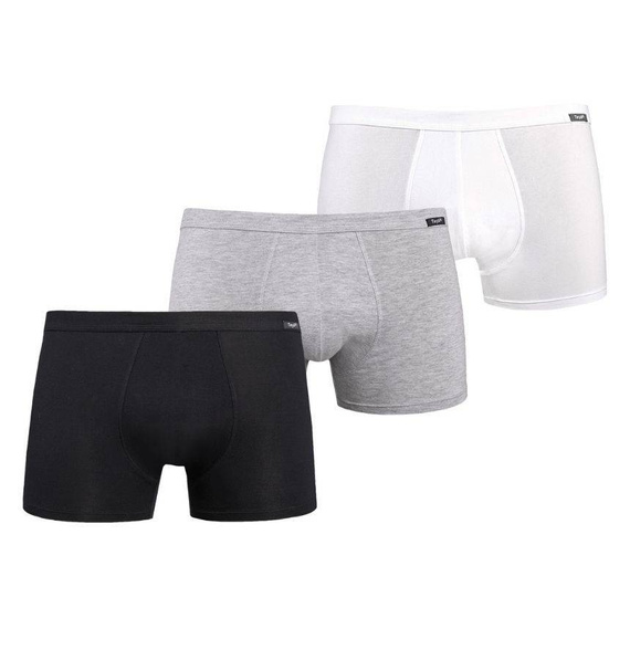 Bokserki męskie wykonane z wysokiej jakości bawełny z dodatkiem elastycznej nici lycry, dzięki czemu idealnie dopasowują się do sylwetki. Właściwości lycry zwiększają ich elastyczność i zapewniają wyjątkowy komfort noszenia.  W pasie wszyta jest szersza elastyczna gumka, która nie zostawia śladów na skórze oraz nie uwiera. Wielopak bokserek męskich w trzech bazowych kolorach białym, czarnym i szarym.