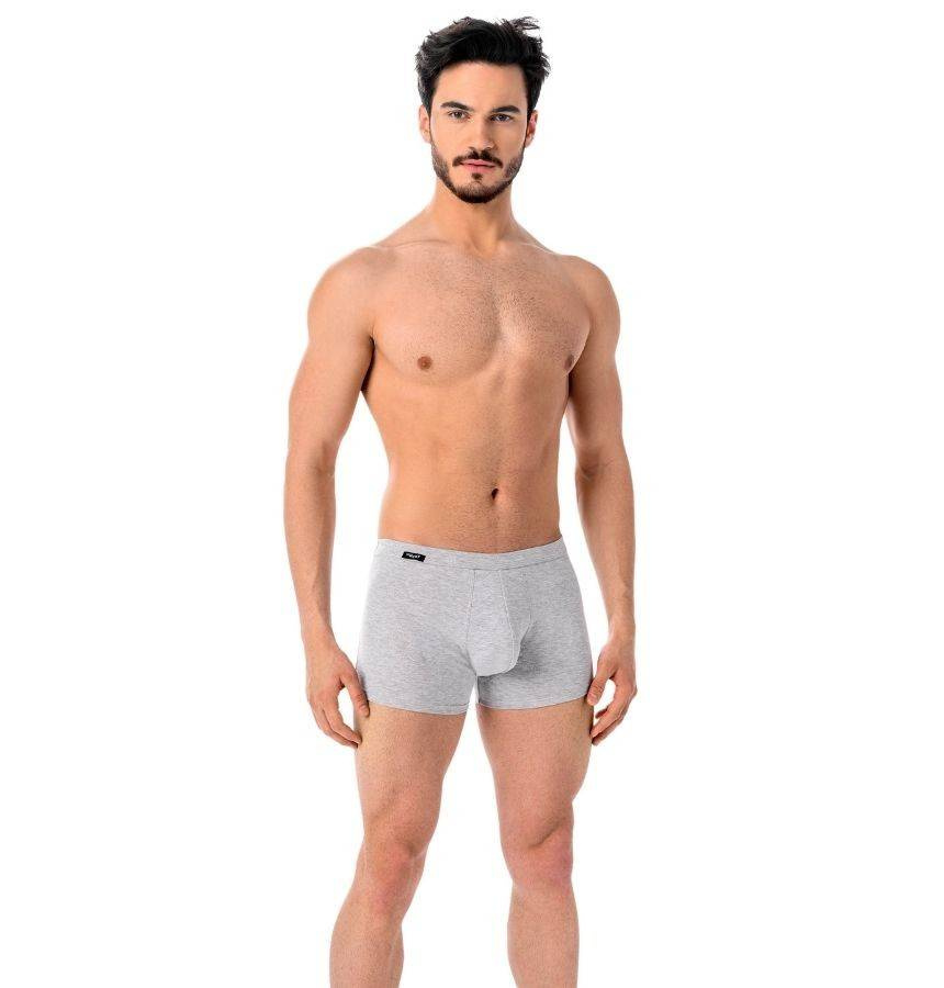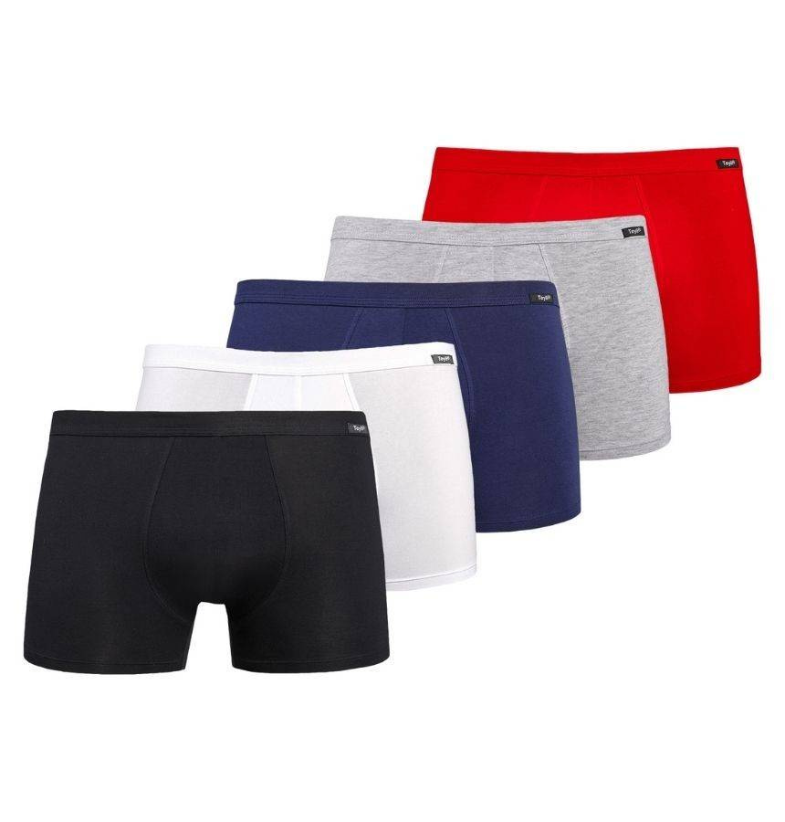 Bokserki męskie wykonane z wysokiej jakości bawełny z dodatkiem elastycznej nici lycry, dzięki czemu idealnie dopasowują się do sylwetki. Właściwości lycry zwiększają ich elastyczność i zapewniają wyjątkowy komfort noszenia.  W pasie wszyta jest szersza elastyczna gumka, która nie zostawia śladów na skórze oraz nie uwiera. Wielopak bokserek męskich w pięciu bazowych kolorach czarnym, białym, niebieskim, szarym i czarnym.
