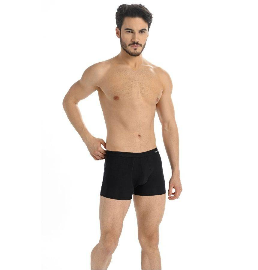 Bokserki męskie wykonane z wysokiej jakości bawełny z dodatkiem elastycznej nici lycry, dzięki czemu idealnie dopasowują się do sylwetki. Właściwości lycry zwiększają ich elastyczność i zapewniają wyjątkowy komfort noszenia.  W pasie wszyta jest szersza elastyczna gumka, która nie zostawia śladów na skórze oraz nie uwiera. Wielopak bokserek męskich w kolorze czarnym.