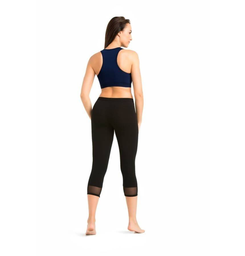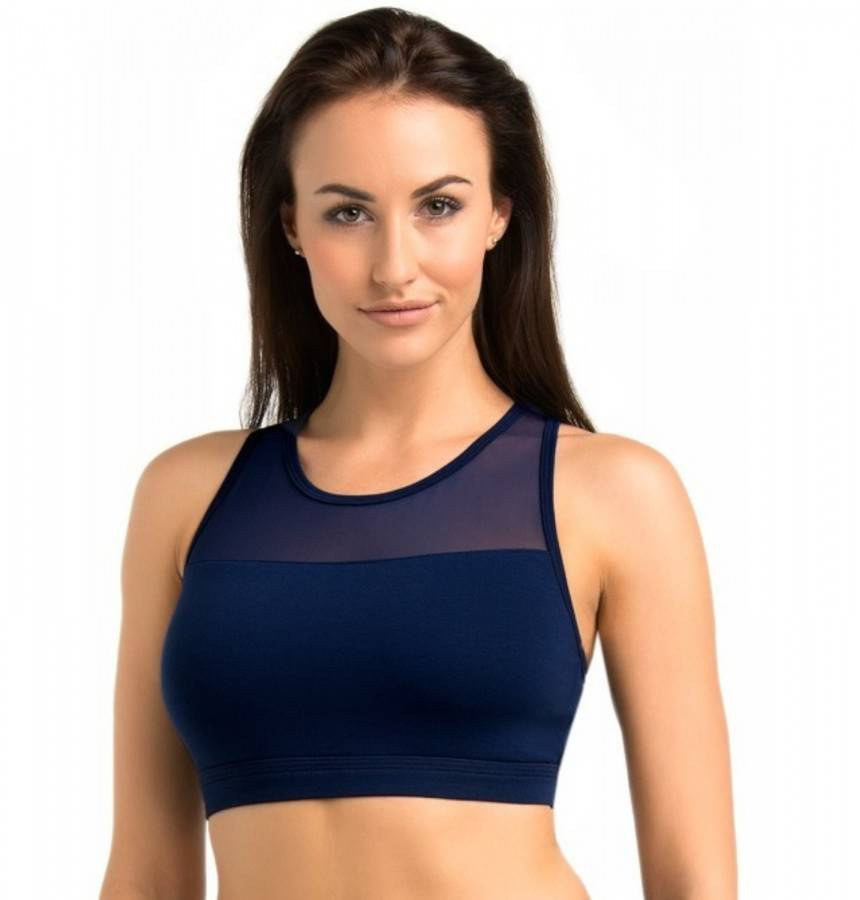 Damski sportowy top wykonany z gęstej wiskozy o wysokiej jakości z dodatkiem lycry. W górnej części połączony jest z półprzezroczystą delikatną i przyjemną dla kobiecego ciała siatką. Dekolt wykończony jest w półkole, obszyty bawełnianą lamówką. Z tyłu jest wycięty jak w bokserce. Długość góry sięga pod biust. Dół wykończony jest listwą, w której środku umieszczono szerszą gumkę, która ma dobrze podtrzymywać piersi podczas użytkowania. W połączeniu z siatką tworzy efektowny wygląd. Można go używać na wiele sposobów, np. do uprawiania sportu, na wieczór i pod kurtkę. Prany w odpowiedniej temperaturze zachowuje swój pierwotny wygląd, nie rozciąga się ani nie wybija, nie jest puszysty. Warto mieć go w swojej garderobie, ponieważ razem z legginsami bawełnianymi tworzą idealny zestaw na siłownię lub do biegania.