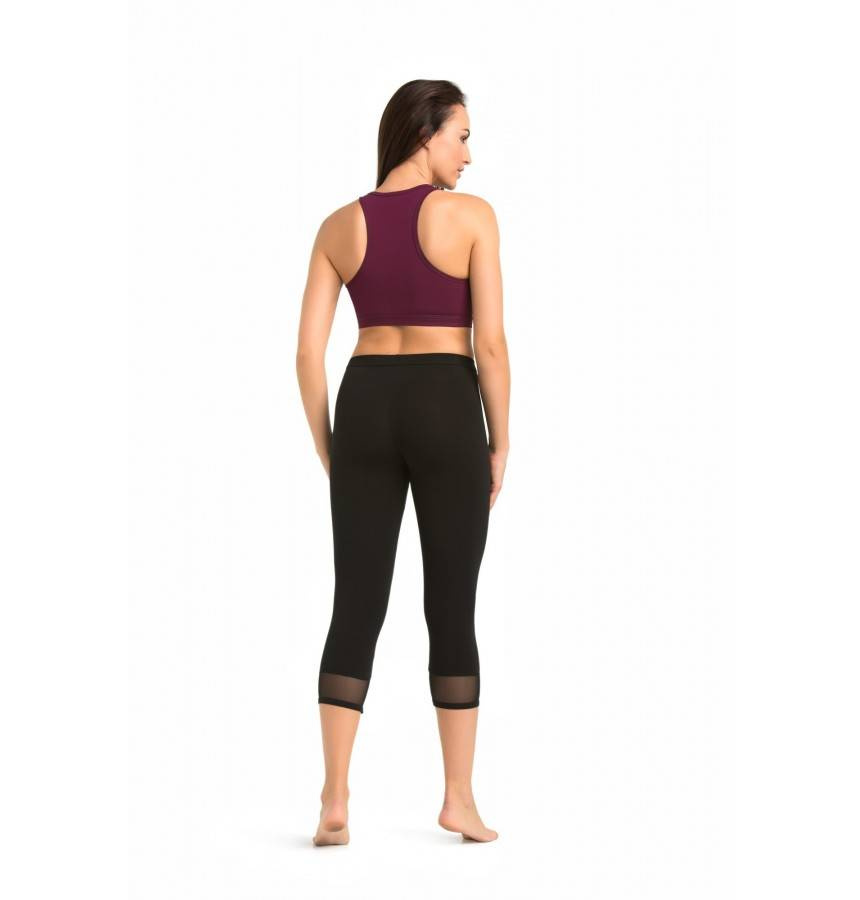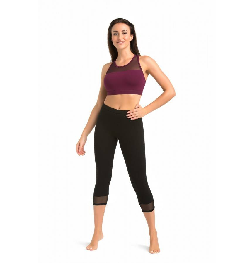 Damski sportowy top wykonany z gęstej wiskozy o wysokiej jakości z dodatkiem lycry. W górnej części połączony jest z półprzezroczystą delikatną i przyjemną dla kobiecego ciała siatką. Dekolt wykończony jest w półkole, obszyty bawełnianą lamówką. Z tyłu jest wycięty jak w bokserce. Długość góry sięga pod biust. Dół wykończony jest listwą, w której środku umieszczono szerszą gumkę, która ma dobrze podtrzymywać piersi podczas użytkowania. W połączeniu z siatką tworzy efektowny wygląd. Można go używać na wiele sposobów, np. do uprawiania sportu, na wieczór i pod kurtkę. Prany w odpowiedniej temperaturze zachowuje swój pierwotny wygląd, nie rozciąga się ani nie wybija, nie jest puszysty. Warto mieć go w swojej garderobie, ponieważ razem z legginsami bawełnianymi tworzą idealny zestaw na siłownię lub do biegania.