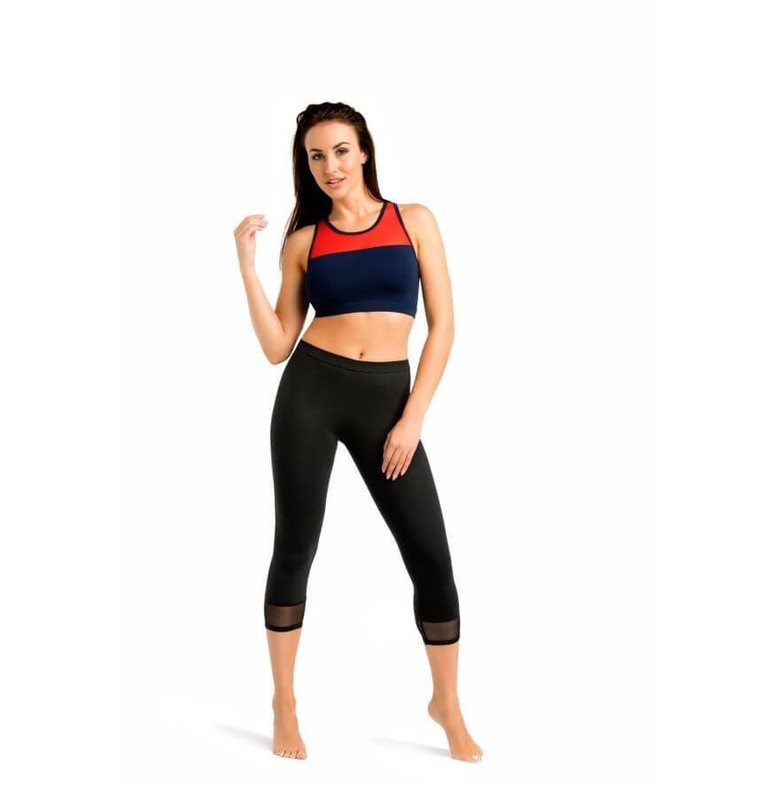 Damski sportowy top wykonany z gęstej wiskozy o wysokiej jakości z dodatkiem lycry. W górnej części połączony jest z półprzezroczystą delikatną i przyjemną dla kobiecego ciała siatką. Dekolt wykończony jest w półkole, obszyty bawełnianą lamówką. Z tyłu jest wycięty jak w bokserce. Długość góry sięga pod biust. Dół wykończony jest listwą, w której środku umieszczono szerszą gumkę, która ma dobrze podtrzymywać piersi podczas użytkowania. W połączeniu z siatką tworzy efektowny wygląd. Można go używać na wiele sposobów, np. do uprawiania sportu, na wieczór i pod kurtkę. Prany w odpowiedniej temperaturze zachowuje swój pierwotny wygląd, nie rozciąga się ani nie wybija, nie jest puszysty. Warto mieć go w swojej garderobie, ponieważ razem z legginsami bawełnianymi tworzą idealny zestaw na siłownię lub do biegania.