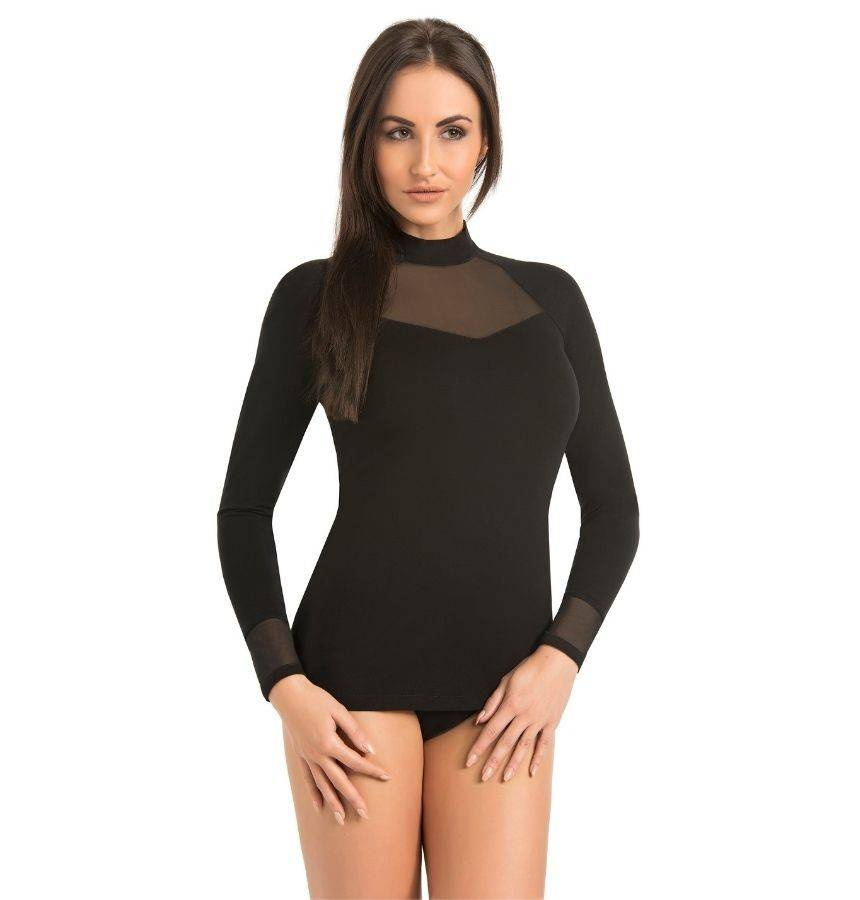 Półgolf damski wykonany jest wysokogatunkowej, przewiewnej i delikatnej wiskozy z dodatkiem elastycznej nici, która ma ogromny wpływ na idealne dopasowanie półgolfu do kobiecej sylwetki. Półgolf damski na dekolcie łączony jest i zdobiony przeźroczystą siatką, która jest bardzo miła w dotyku, elastyczna i dodaje elegancji i szykowności. Półgolf długością sięga do połowy pośladków, rękawy są długie i mocno dopasowane. Wokół szyi wykończony jest szerszą podwójną listwą, która mocno przylega do szyi. Półgolf damski sprawdzi się na co dzień do pracy w połączeniu z dopasowaną ołówkową spódnicą i szpilkami. Na wspólnych wieczornych spotkaniach towarzyskich będzie również idealnie prezentował się na kobiecej sylwetce. Półgolf jest bardzo wygodny i komfortowy w codziennym użytkowaniu. Wysoka jakość tkaniny gwarantuje długoterminowe użytkowanie i zadowolenie z produktu.