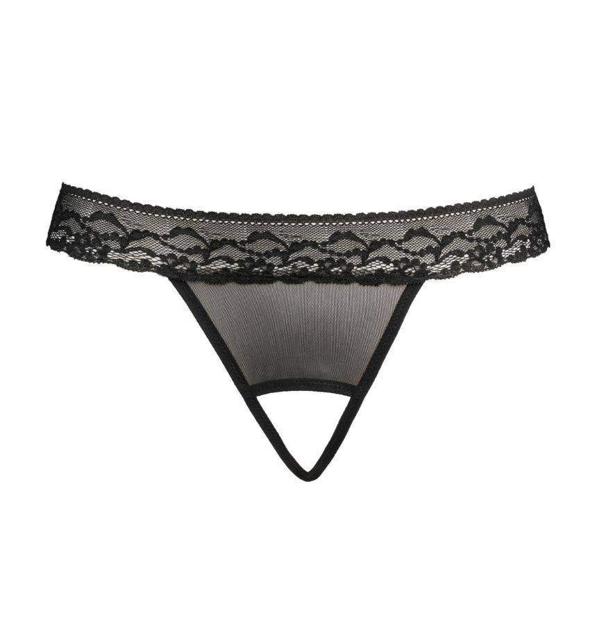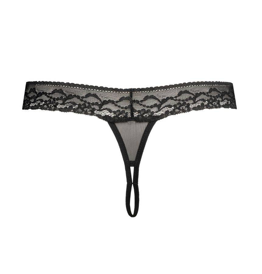 Damskie stringi z dziurką w kolorze czarnym. Wykonane są z wysokiej jakości przewiewnej, delikatnej, i cienkiej przeźroczystej siatki z dodatkiem elastycznej koronki o wyrazistym motywie kwiatowym. Stringi są niezwykle seksowne, z przodu w kroku posiadają otwór, natomiast górny trójkącik wykonany jest z przeźroczystej siatki.