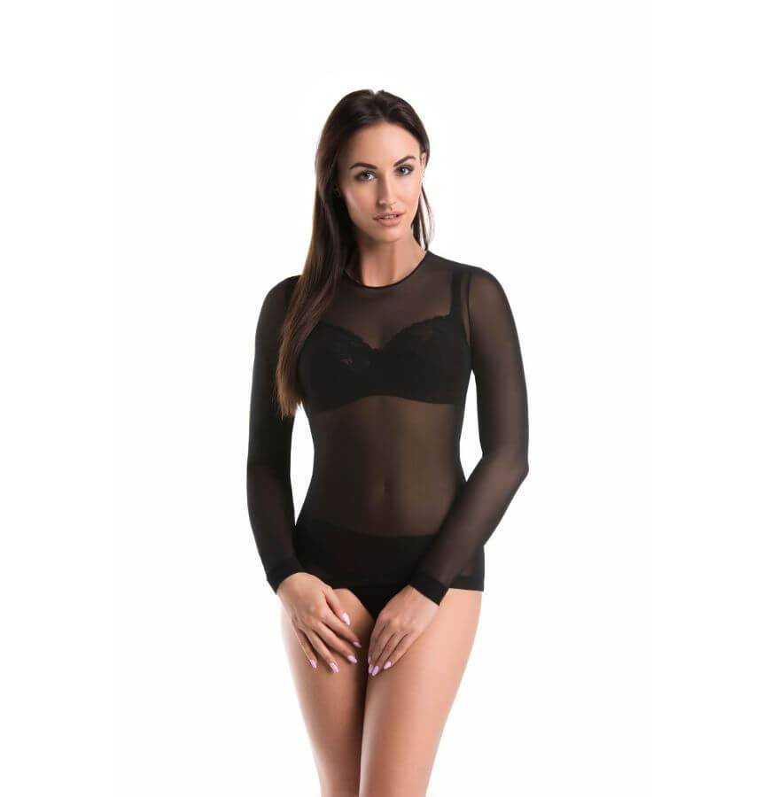 Bluzeczka klasyczna damska w kolorze czarnym. Wykonana z eleganckiej, szlachetnej i przeźroczystej siatki. Wysokogatunkowy materiał sprawia, że ciało nie poci się i oddycha. Idealnie przylega do sylwetki, nadając kobiecie elegancki i powabny wygląd. Bardzo dobrze komponuje się z wąskim rękawem. Pod szyją wycięta jest na półokrągło, co nadaje jej lekkości. Swoją długością sięga do bioder. Idealnie pasuje do marynarki i dlatego tez można założyć ją na wieczorne wyjścia na randkę, czy chociażby do klubu. Pięknie komponuje się z czarną bielizną, która jest widoczna spod bluzki, a także doskonale prezentuje się w połączeniu z klasycznymi spodniami. Taki siateczkowy top to propozycja dla kobiet, które nie boją się odsłonić trochę ciała, dlatego powinien znaleźć swoje miejsce w szafie każdej odważnej kobiety. Niezwykle seksowny top, pobudzający zmysły mężczyzn.