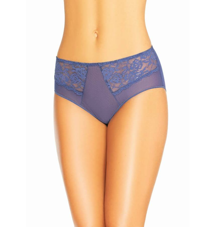 Figi klasyczne z wysokim stanem z przezroczystej i miękkiej w dotyku siatki połączonej z elegancką delikatną o motywie kwiatowym koronką, która wszyta jest z przodu po obu stronach.