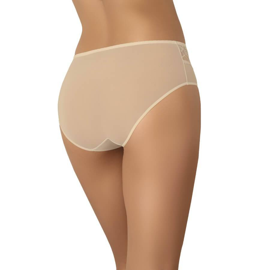 Figi klasyczne z wysokim stanem z przezroczystej i miękkiej w dotyku siatki połączonej z elegancką delikatną o motywie kwiatowym koronką, która wszyta jest z przodu po obu stronach.