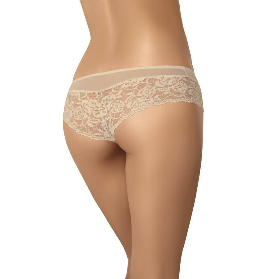 Figi wykonane z wysokogatunkowej wzorzystej koronki  połączonej z delikatną i miłą w dotyku i dla kobiecej skóry prześwitującą siatką. Takie zestawienie komponuje się ze sobą niebywale seksownie i efektownie.