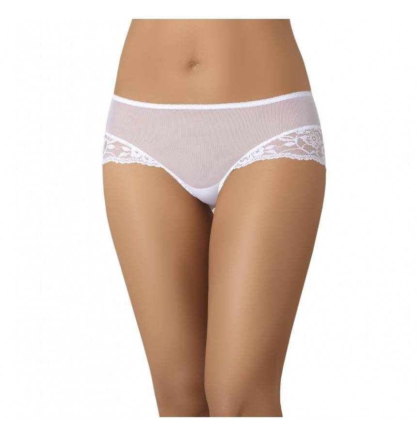 Szorty wykonane z delikatnej, przeźroczystej siatki, połączonej z koronką o pięknym drobnym motywie kwiatowym i delikatnym szwem z przodu.