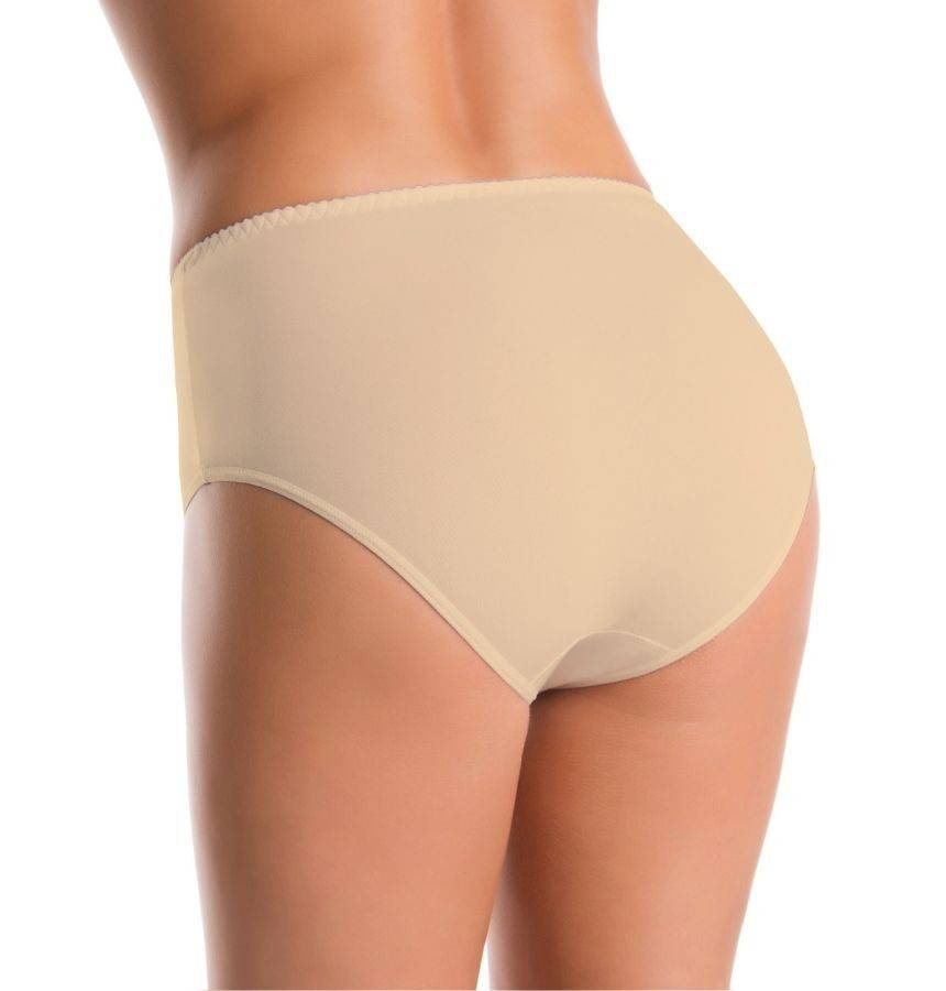 Majtki posiadają klasyczny prosty fason i są adresowane do kobiet ceniących sobie prostotę. Nie posiadają żadnych wzorów i zdobień, są gładkie. Majtki bawełniane z wysokim stanem doskonale sprawdzają się pod dopasowaną wierzchnią odzieżą. Kolor beżowy komponuje się z ciałem i dlatego doskonale sprawdzają się pod białymi spodniami, ponieważ są niewidoczne.