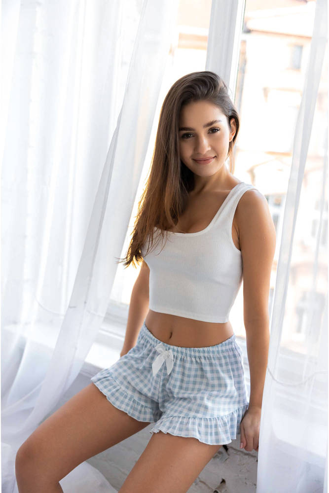 Piżama damska wykonana z wysokiej jakości delikatnej bawełny. Krótki top na szerokich ramiączkach z prążkowanej bawełny.