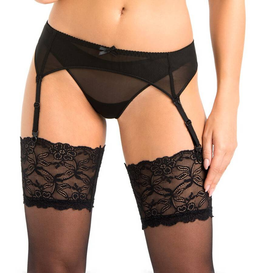 Pas do pończoch wykonany jest z wysokogatunkowej delikatnej dla kobiecego ciała i w dotyku  przezroczystej siatki, która jest niezwykle efektowna.