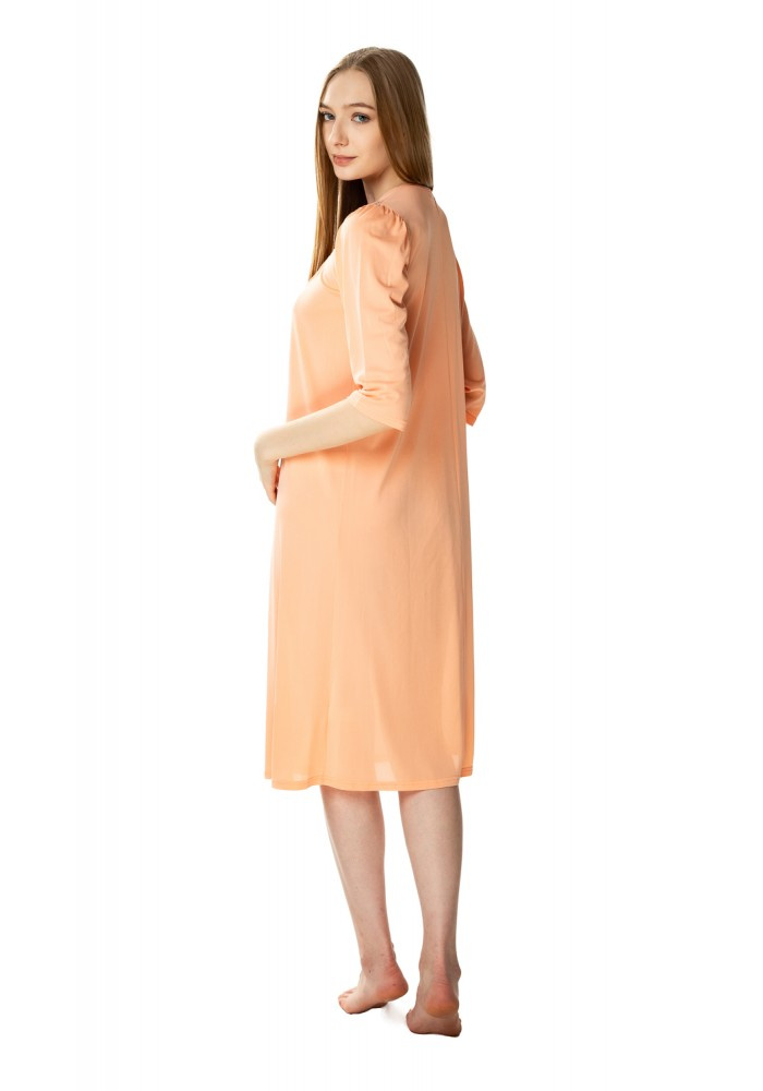 Model Diana posiada długość "za kolano" oraz wygodny rękaw 3/4. Dekolt został ozdobiony uroczą koronką oraz małą tekstylną kokardką. Luźny, zwiewny fason pozwala na dużą swobodę ruchów. Z pewnością spodoba się także Paniom plus size.