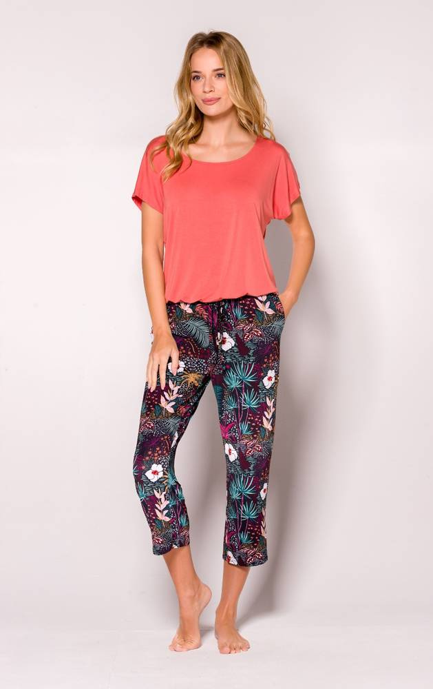 Model wykonany z miłej wiskozy. Koszulka z krótkimi rękawkiem , gładka. Dekolt duży, okrągły. Do kompletu spodnie typu rybaczki wzorzyste.