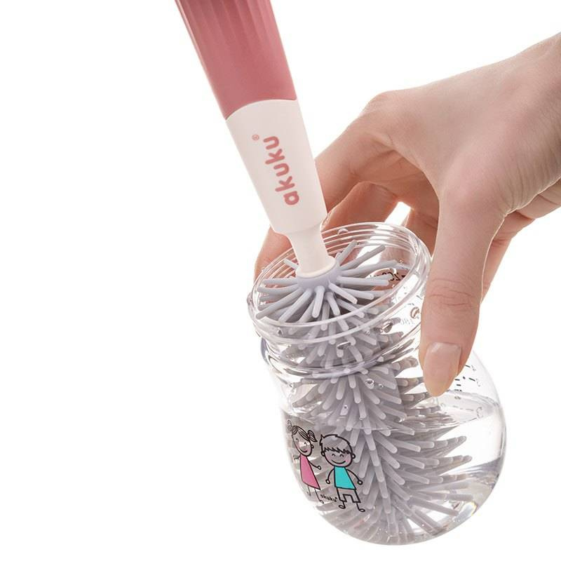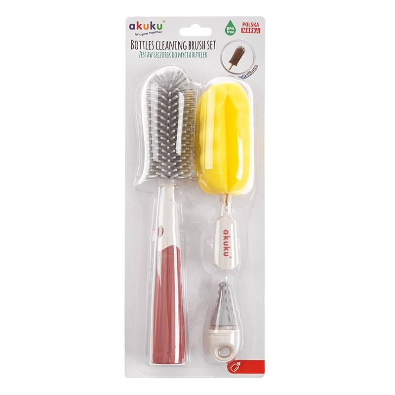 Zestaw jest wyposażony w dwie wymienne końcówki do mycia butelek. Składa się ze szczotki z miękkim silikonowym włosiem, która zapewnia mycie butelek i bidonów bez zarysowań oraz wymiennej końcówki z gąbką. Dociera do trudno dostępnych miejsc, a wygodna antypoślizgowa rączka zapewnia stabilny uchwyt. Komplet zawiera dodatkowo silikonową końcówkę do czyszczenia smoczków. Szczotka posiada otwór do zawieszenia w celu osuszenia przed kolejnym użyciem. Wykonana z trwałych i bezpiecznych materiałów, nie zawierających Bisfenolu A (% BPA).
