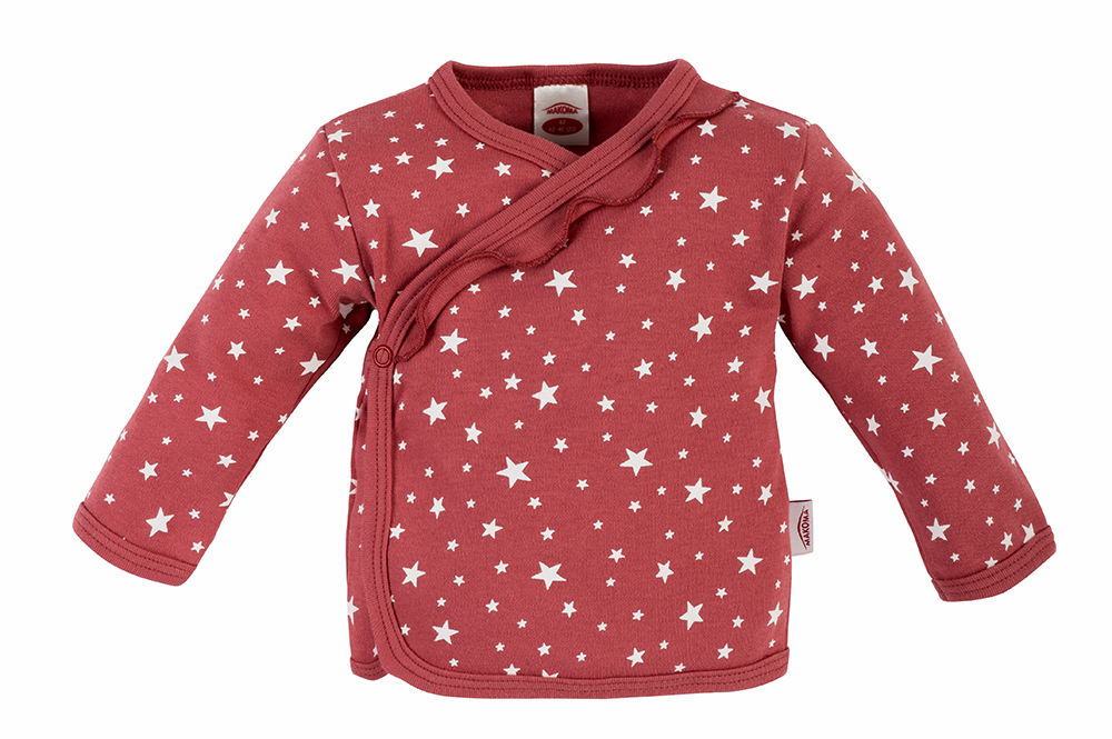 Kaftanik niemowlęcy wykonany ze 100% bawełny. Do produkcji zatrzasków użyto antyalergicznego, bezniklowego tworzywa. Wykończony lamówką. Nadruk wykonano bezpieczną metodą farb wodnych, który zapewnia im trwałość nawet po wielu praniach.