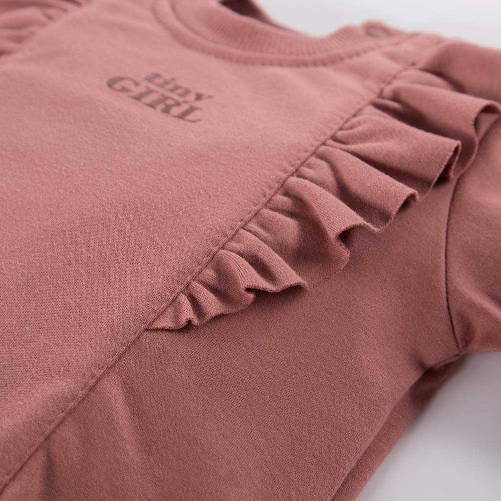 Bluza dresowa uszyta z miękkiej i przyjemnej w dotyku dzianiny dresowej z delikatnym nadrukiem i ozdobną falbanką.