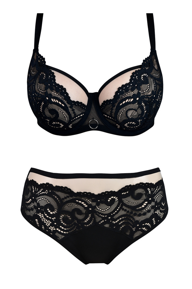 Biustonosz półusztywniony, skierowany do pań z dużym i średnim biustem. Miseczki z beżowej pianki, ich dolna część została pokryta czarną koronką, góra wykonana z siateczki zakończonej czarną lamówką. Konstrukcja zapewni doskonałe podtrzymanie i komfort użytkowania.