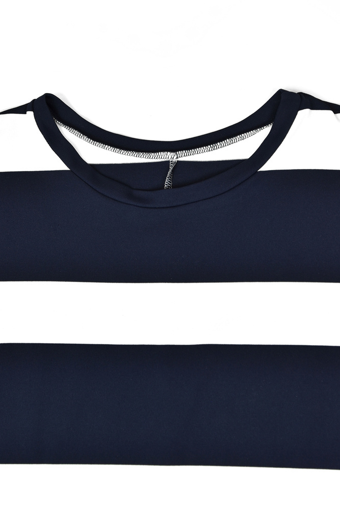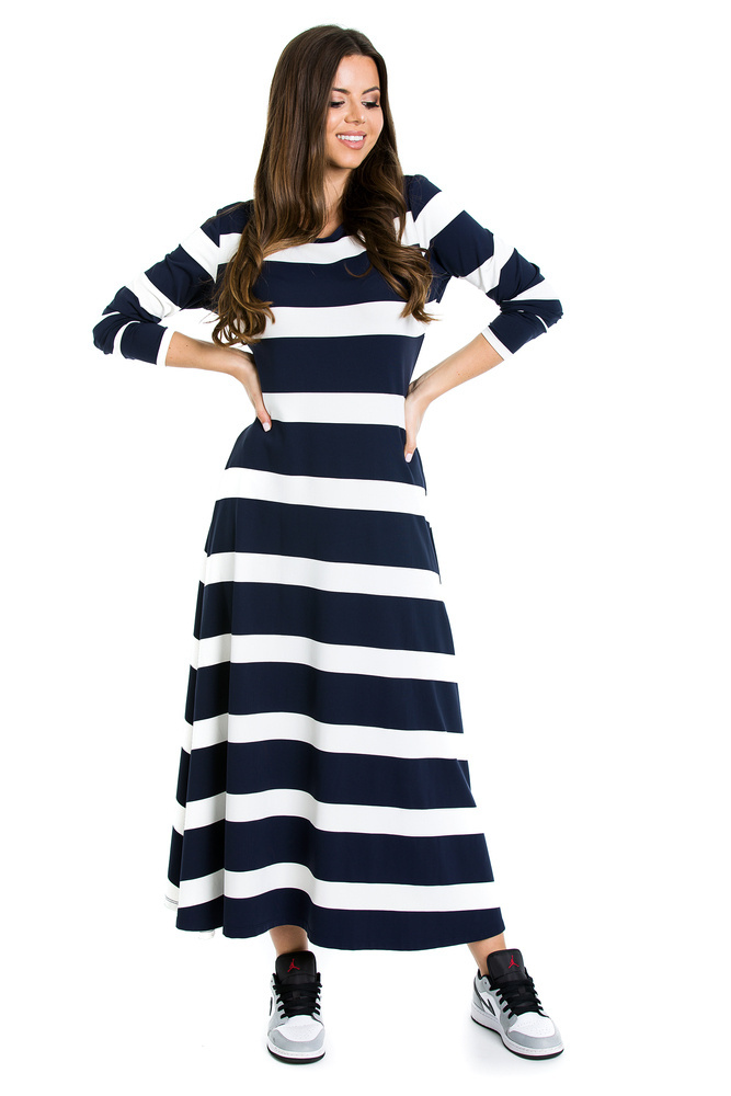 Sukienka wykonana z mikrofibry. Model w szerokie granatowe pasy. Fason idealny dla każdej sylwetki, góra przylegająca do ciała, dół rozszerzony w kształcie litery A, na boku rozcięcie.