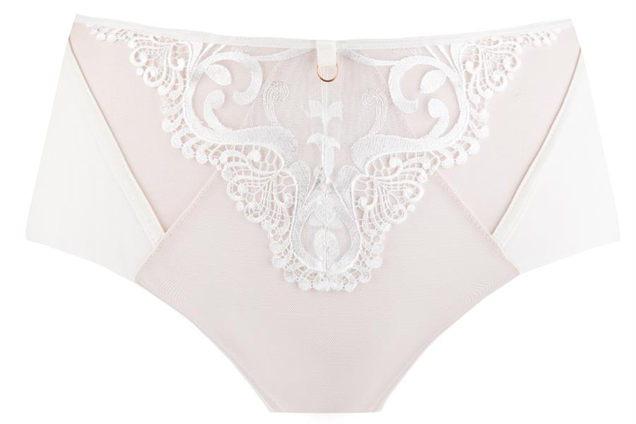 Figi o mocniej zabudowanym kroju. Dzięki swojemu fasonowi pozwolą na ukrycie małych niedoskonałości, a zarazem podkreślą kształtne pośladki. Przyciągają wzrok doskonałym połączeniem haftu i dzianiny, które dopieszczają delikatne prześwity.