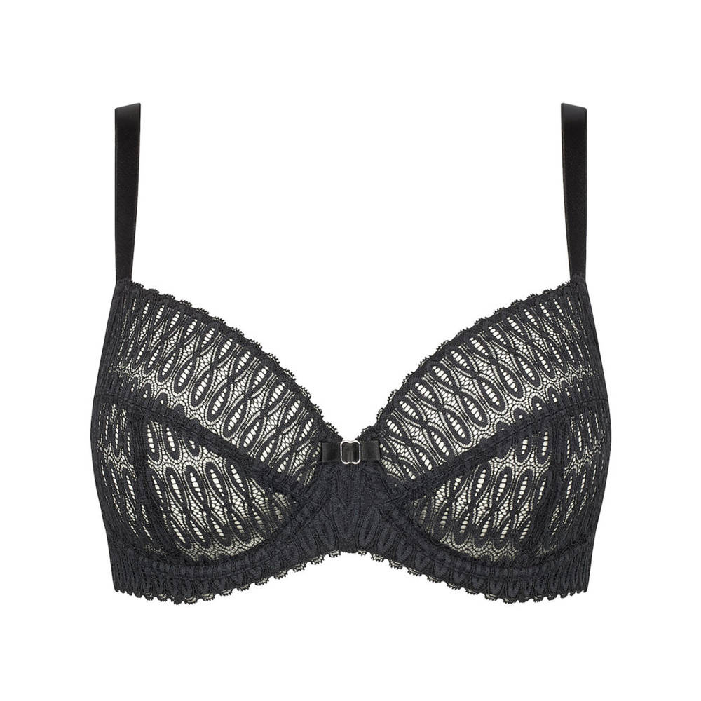 Miseczki wykonane z podtrzymującej i uroczej wzorzystej koronki. Elegancki, zakrzywiony dekolt z gumką zapewnia idealne pokrycie biustu. Regulowane ramiączka i trójstopniowe zapięcie na haftki.