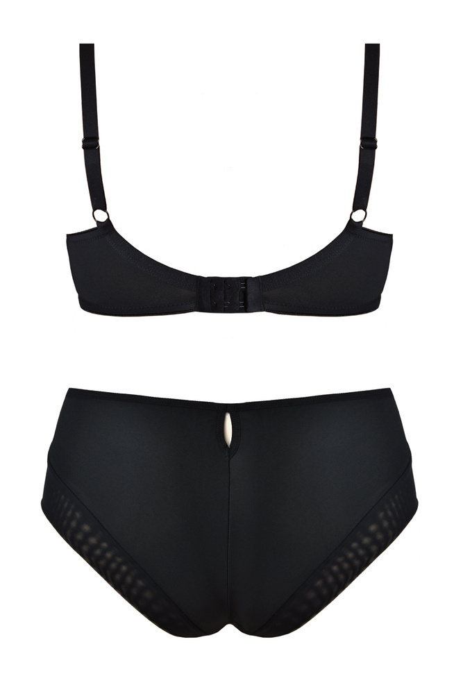 Miski wykonane są z materiału o nazwie "spacer fabric" - są lekkie i oddychające. Trójwymiarowa tkanina, zbudowana z 2 cienkich warstw połączonych ze sobą włókniną dystansową, zapewnia przepływ powietrza i lekkość materiału. W okolicach mostka wszyty tiul, na środku dodany element biżuterii. Dodatkowym atutem jest wzmocnienie misek bocznym panelem z tiulu. Boki i tył wykonane są z mikrofibry. Biustonosz nie posiada bocznych fiszbin.  RAMIĄCZKA UŻYTE W WIĘKSZYCH ROZMIARACH (65H 65I 70G 70 H 70I 75F 75G 75H 80E 80F 80G 80H 85D 85E 85F 85G) SĄ PODSZYTE WELUREM, zapewnia to większy komfort noszenia.