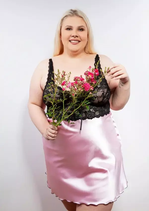 Zmysłowa satynowa haleczka firmy DKaren. Górę koszulki tworzą dopasowane profilowane miseczki z delikatnej elastycznej koronki. Dół halki jest satynowy. We wszystkich modelach koronka jest w kolorze czarnym.