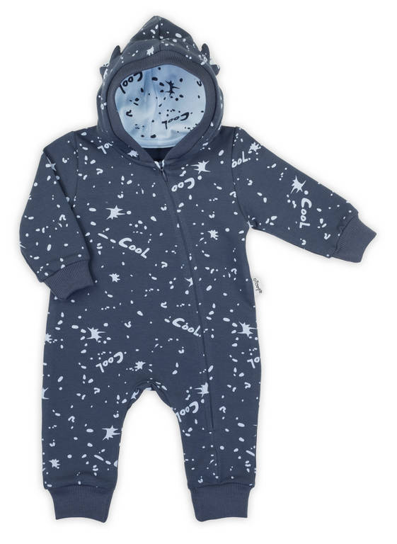 Pajac dresowy z kapturem. Możliwość całkowitego rozpięcia umożliwia łatwe i szybkie ubieranie dziecka. Dodatkowy klin w kroku i ściągacze na stopach zapewniają swobodę użytkowania i nie krępują ruchów dziecka.