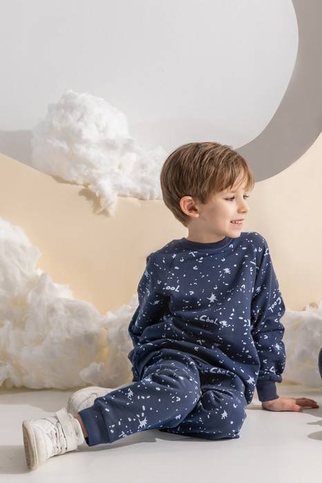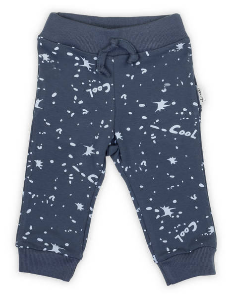 Modne spodnie dla chłopca. Wykonane z bawełny 100% w kolorze granatowym, która jest całkowicie bezpieczna dla skóry dziecka. Spodnie posiadają ściągacz w pasie oraz przy nogawkach. Produkt zdobi imitacja kieszonek oraz sznureczek w pasie.