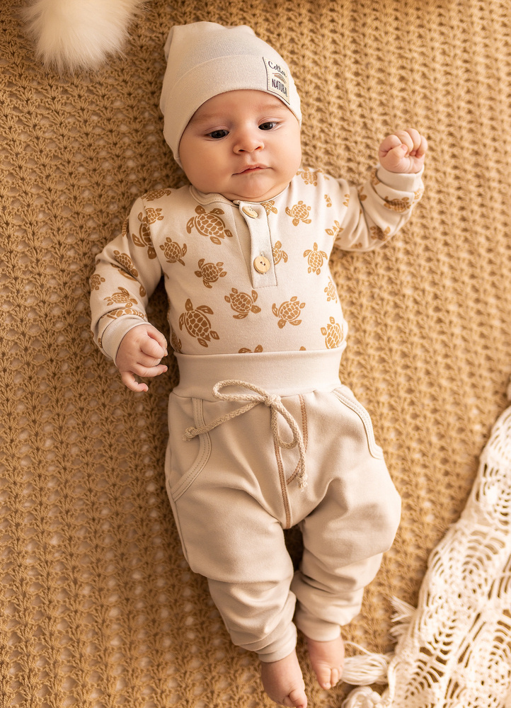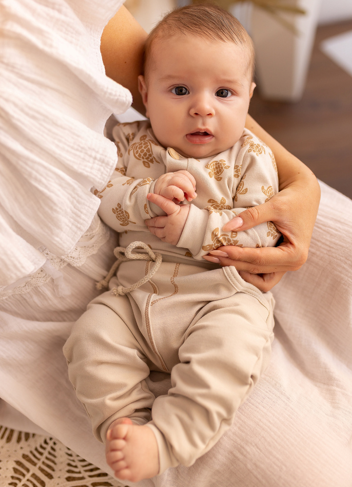 Wygodne spodnie dresowe. Wszyty w pasie nieuciskający ściągacz z gumką, utrzymuje ubranko w odpowiednim miejscu. Swobodny fason spodni zapewni dziecku wygodę w trakcie nauki chodzenia, raczkowania czy zabawy.