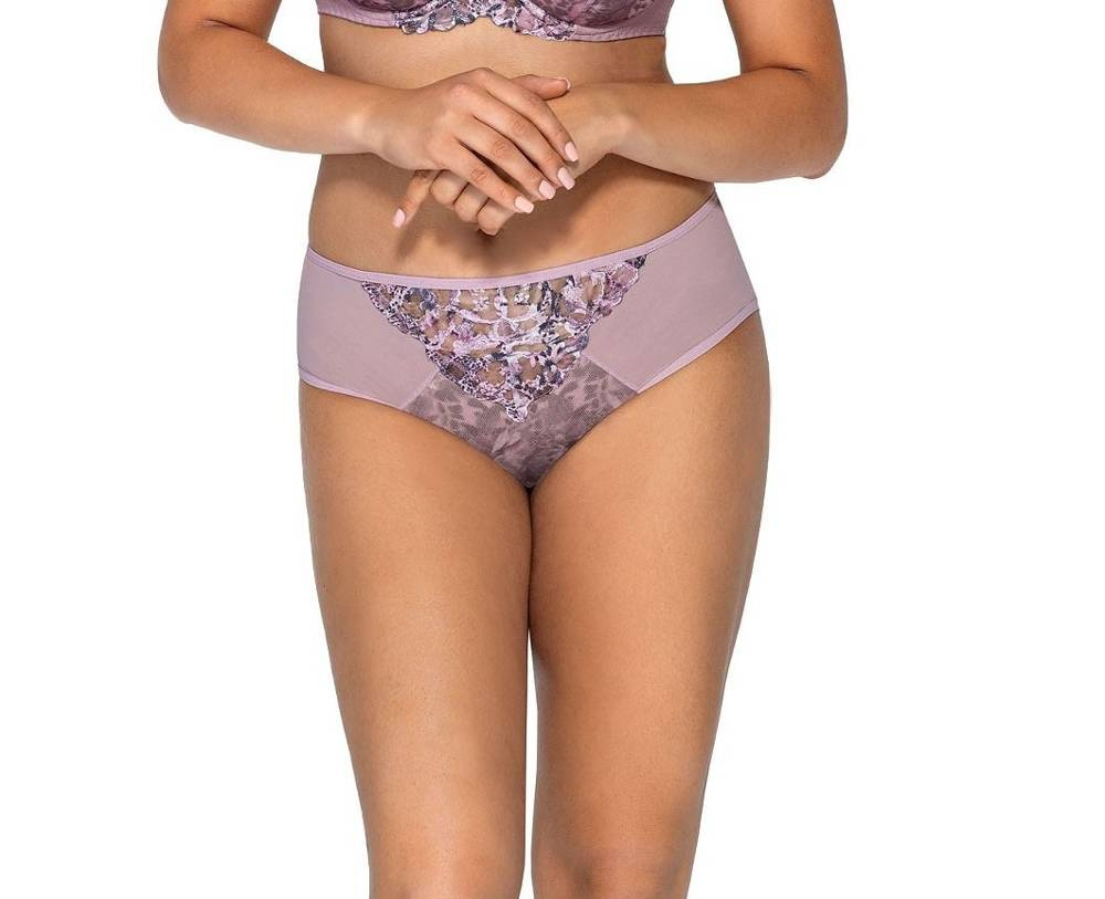 Figi damskie o pełnym, klasycznym kroju. Wykonane z siateczki z ozdobnym delikatnym wzorem.