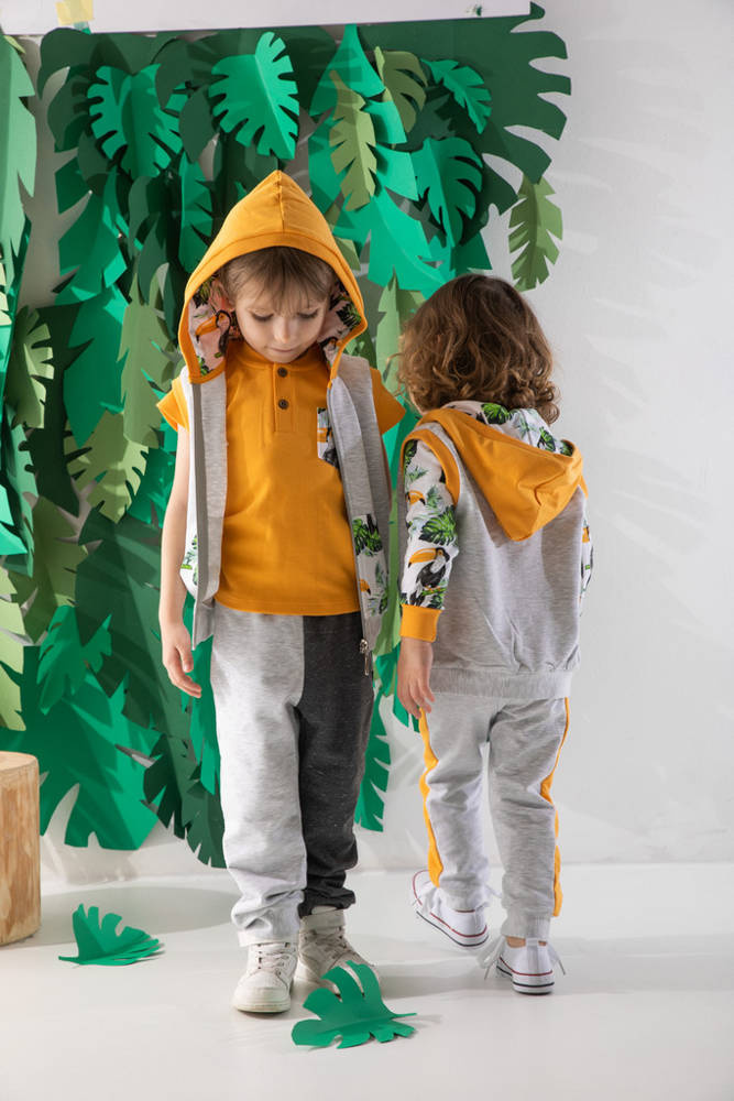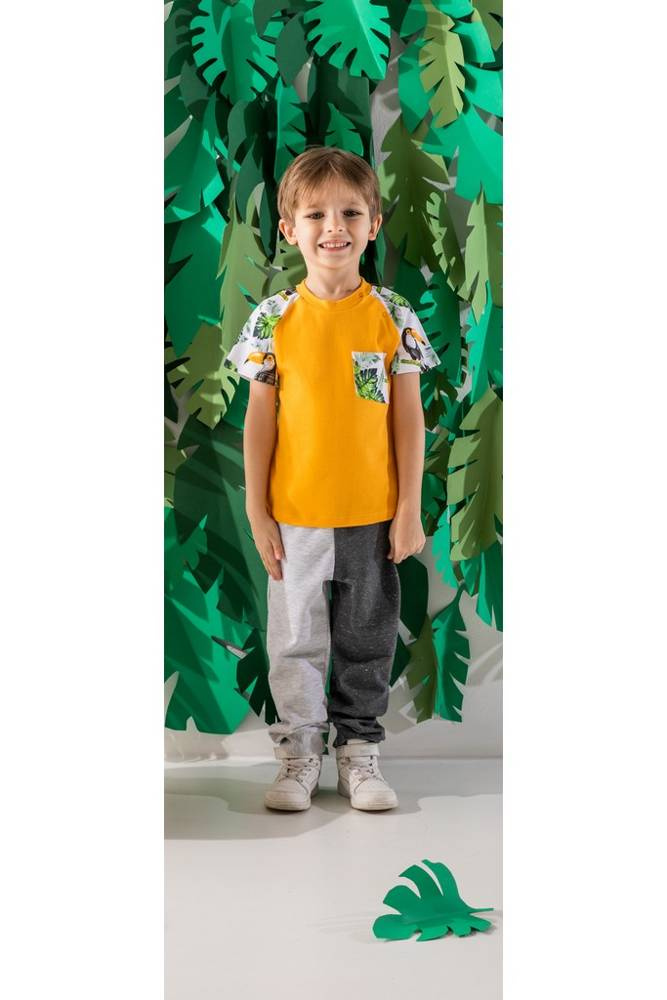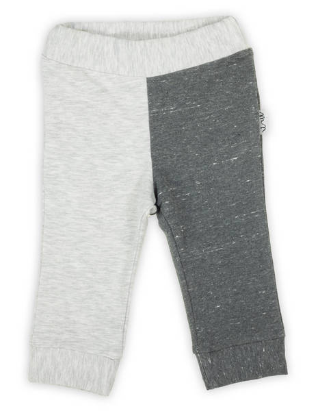 Modne spodnie dla chłopca wykonane z bawełny dresowej, która jest całkowicie bezpieczna dla skóry dziecka. Jedna nogawka jest w kolorze szarym, a druga w kolorze grafitowym. Spodnie posiadają ściągacz w pasie oraz przy nogawkach. Produkt zdobią kieszonki.