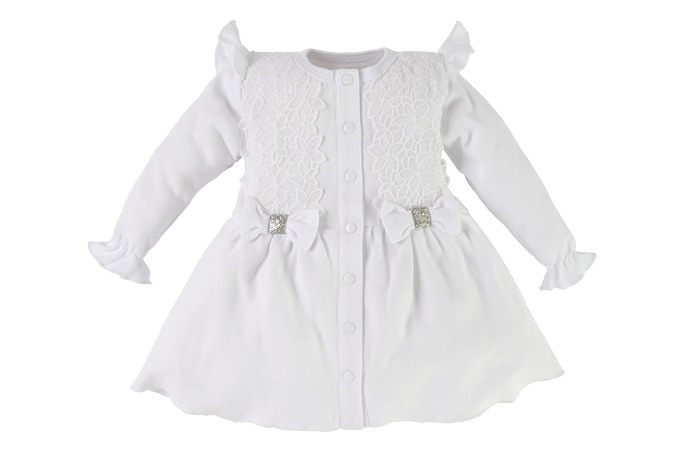 Zapytaj o produktSukienka z kolekcji Princess dla małych dziewczynek. Uszyta z białej dzianiny 100% bawełna, jest miękka i przewiewna. Sukienkę zdobi piękna koronka na przodzie, dwie kokardy z dodatkiem cekinów, białe napki w postaci białych guzików, rękawki zdobią skrzydełka oraz wykończone są falbanką. Sukienkę łatwo się zakłada, jest rozpinana z przodu po całości. Idealna na specjalne okazje jak np Chrzest święty.