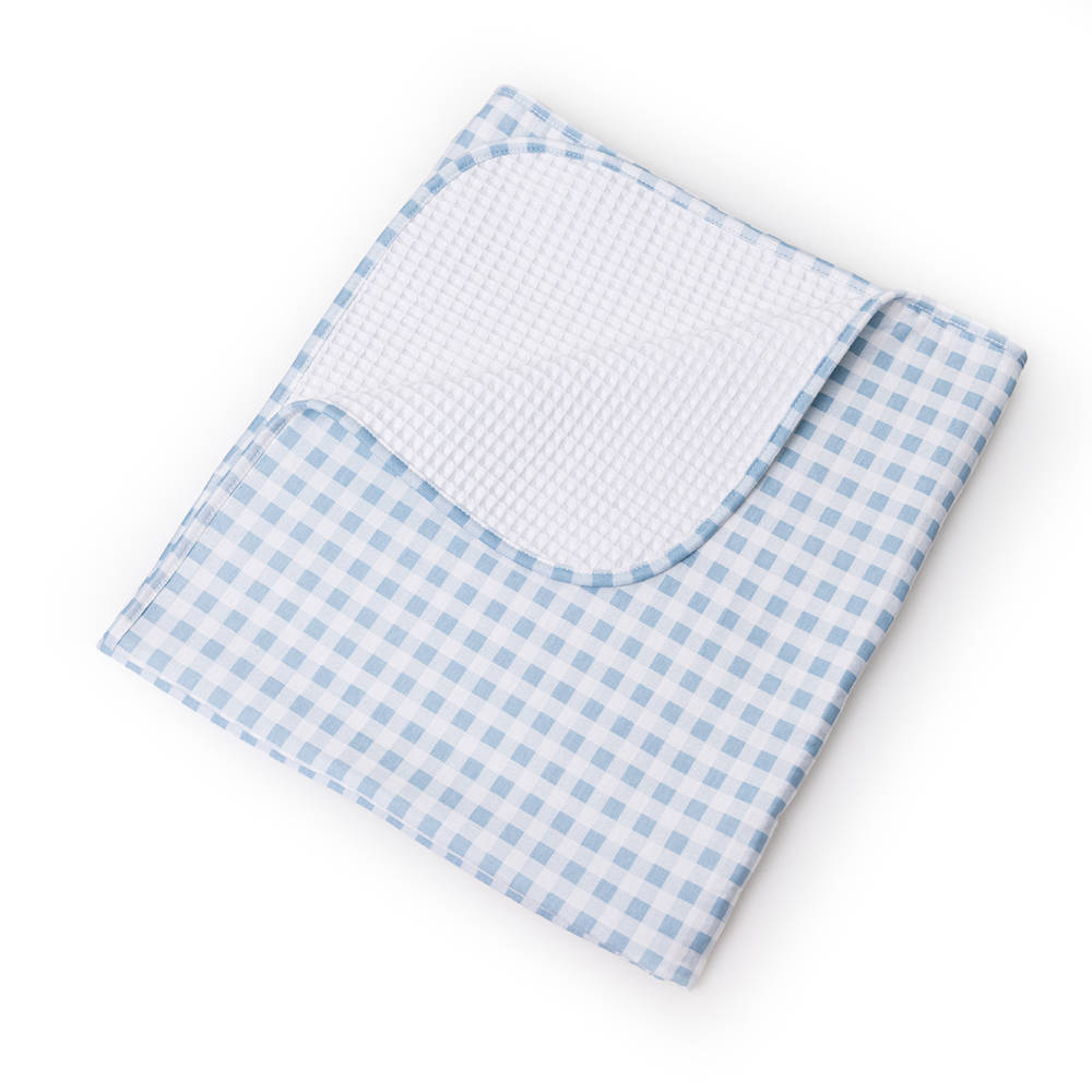 Jedna strona kocyka wzorzysta, druga strona w tłoczony wzorek w kolorze niebieski.