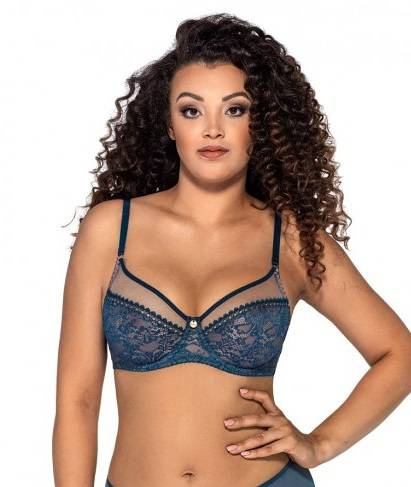 Biustonosz typu soft z fiszbinami. Miseczki obszyte koronką w lazurowym kolorze, a od środka podszyte dodatkową siateczką.