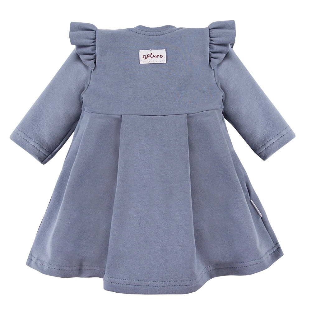 Sukienka dziewczęca z kolekcji "Ceremony" uszyta z miękkiej i przyjemnej w dotyku dresowej dzianiny. Posiada ozdobne falbany. Rozpinana na ramionku. Elementem ozdobnym jest naszywka na karku. Krój sukienki jest rozkloszowany.