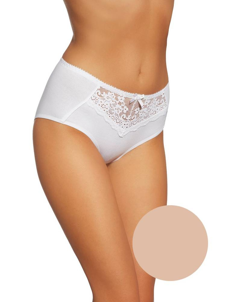 Efektowne bawełniane figi damskie z wysoką linią talii, zabudowane na biodrach. Przód został ozdobiony koronkowymi wstawkami.