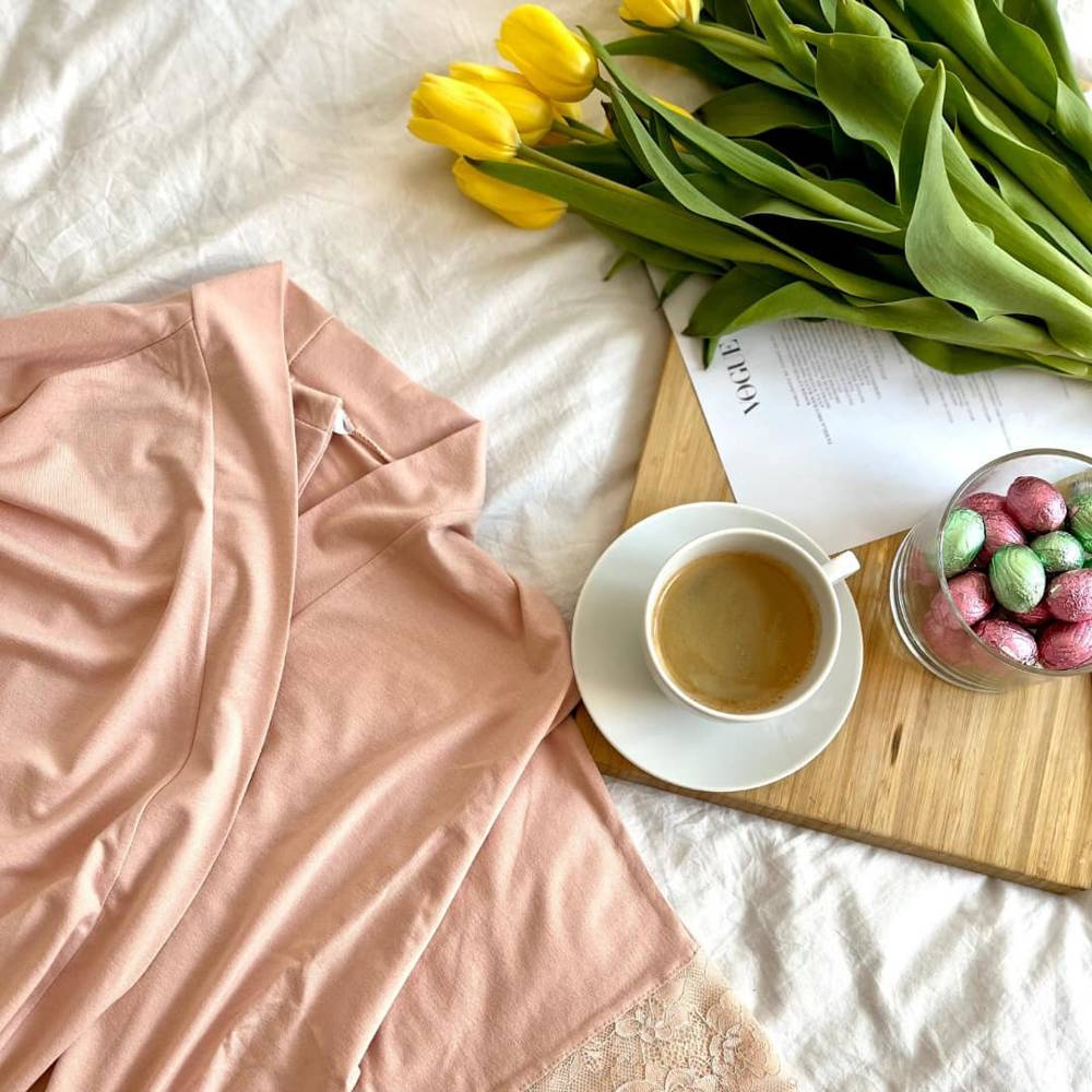 Szlafrok damski z wysokiej jakości wiskozy 94% z dodatkiem elastanu. Model wiązany w pasie, z krótkim rękawem. Mankiety wykończone ażurową koronką. Kopertowy fason z paskiem świetnie dopasowuje się do sylwetki. Szlafrok idealnie komponuje się z koszulą bądź piżamą dostępną w naszej kolekcji bielizny nocnej. W szlafroku możesz zachwycać i olśniewać swoją urodą, nawet jeśli tylko wybierasz się w nim do sypialni.