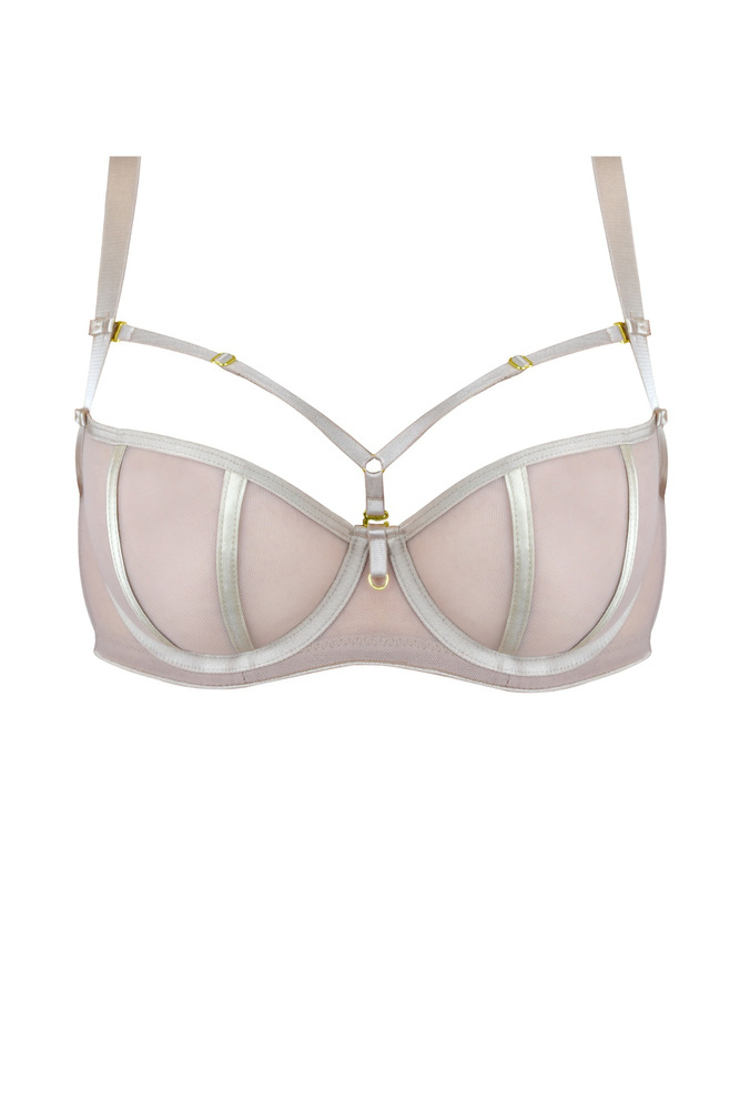 Biustonosz o kroju balkonetki. Miseczki są wykonane z siatki, satynowe lamówki przykrywają pionowe cięcia. Ozdobne paseczki ozdobią dekolt, odpinają się. Konstrukcja doskonale wyeksponuje biust.