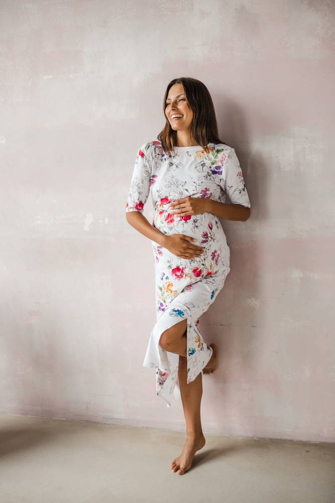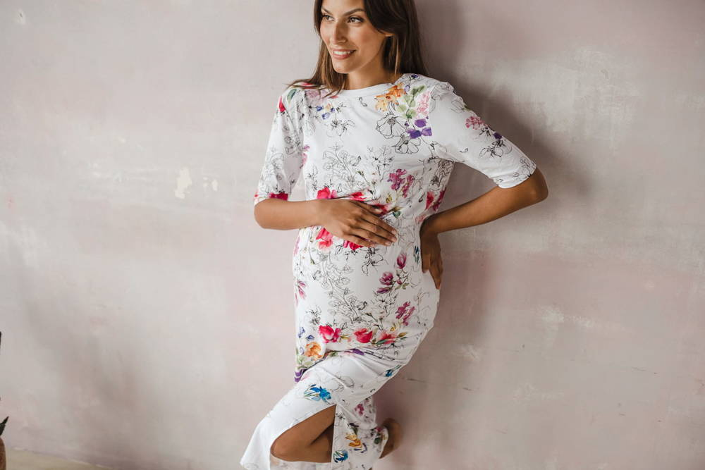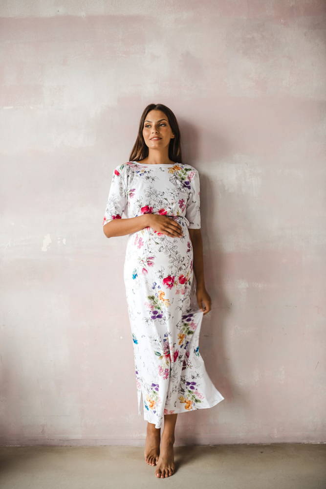 Opinie o Sukienka ciążowa i do karmienia Two Ways LONG Milk&Love biała w kolorowe kwiaty