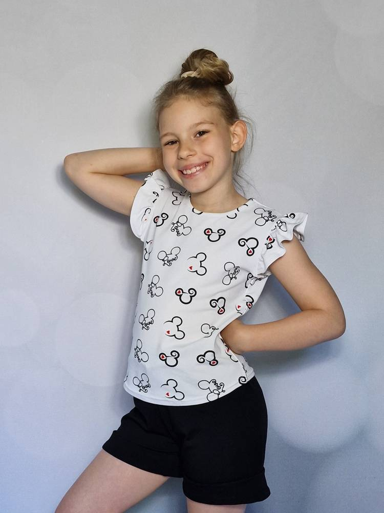 Koszulka dziecięca uszyta z miękkiej i przyjemnej w dotyku bawełny. Ozdobiona wzorem w myszki. Modny krój, elegancja i niepowtarzalność!