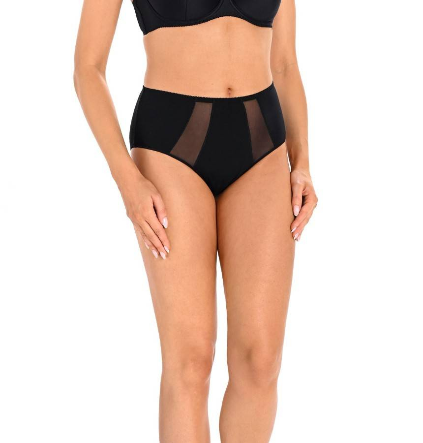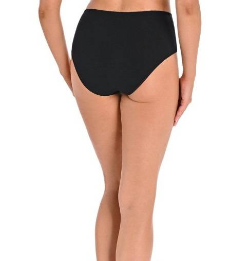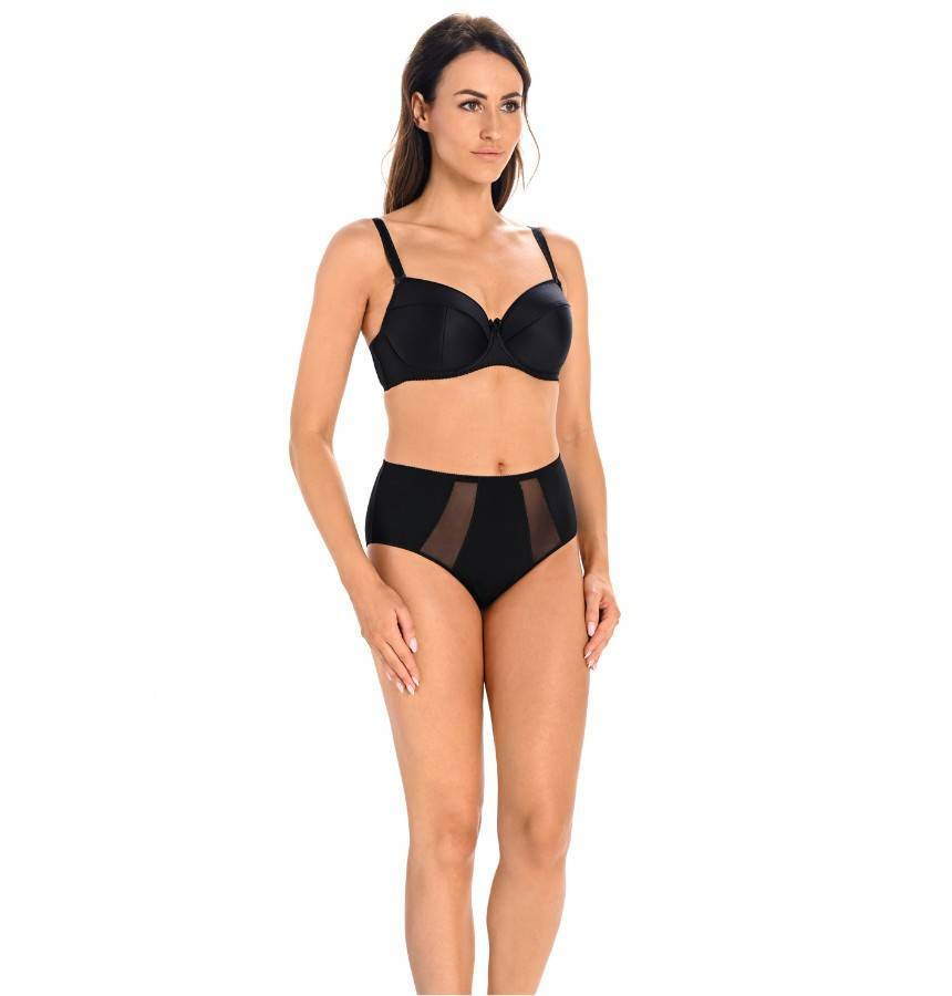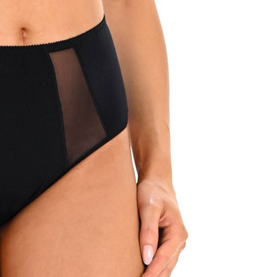 Klasyczne majtki damskie z wysokim stanem. Są bardzo wygodne w codziennym użytkowaniu, z uwagi na wysoki stan i wysokie zabudowanie z boku kryją kobiece niedoskonałości. Z przodu majtki zestawione są z prześwitującą siatką o delikatnym drobnym splocie, która wszyta jest pod skosem, zdobi i nadaje efektowny wygląd. Z tyłu majteczki są mocniej zabudowane wykończone delikatną cienką elastyczną gumką, która idealnie dopasowuje się do pośladków, nie przecina ich, nie zostawia śladów na skórze.
