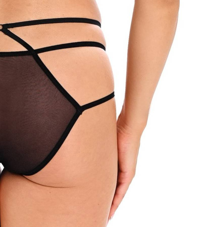 Czarne seksowne figi damskie wykonane z cienkich, ozdobnych pasków i lekko przeźroczystej siatki. Ozdobne paski są na tyle elastyczne, że idealnie dopasowują się do kobiecych kształtów.