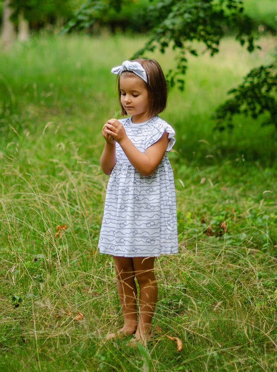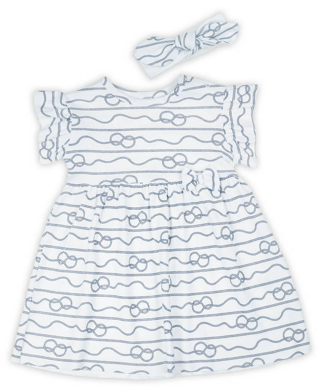 Dziewczęca sukienka w kolorze białym. Luźny fason nie krępuje ruchów. Sukienka zapinana jest na ramionach, co znacznie ułatwia ubieranie i rozbieranie maluszka. Zatrzaski wykonano z antyalergicznego, bezpiecznego tworzywa bez dodatku niklu. Doskonałym uzupełnieniem dla sukienki jest opaska z zestawu.