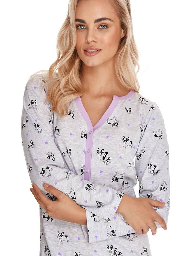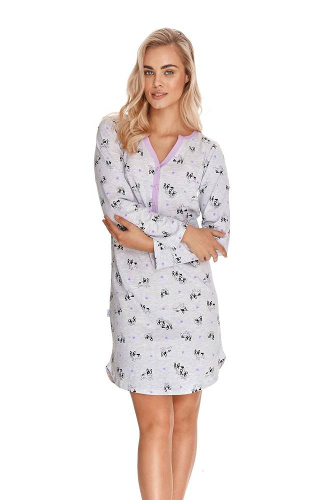 Koszula nocna z miękkiej bawełny. Zdobione printem w pieski. Dekolt zdobiony lamówką w kontrastującym kolorze, zapinany na zatrzaski. Długość przed kolano.